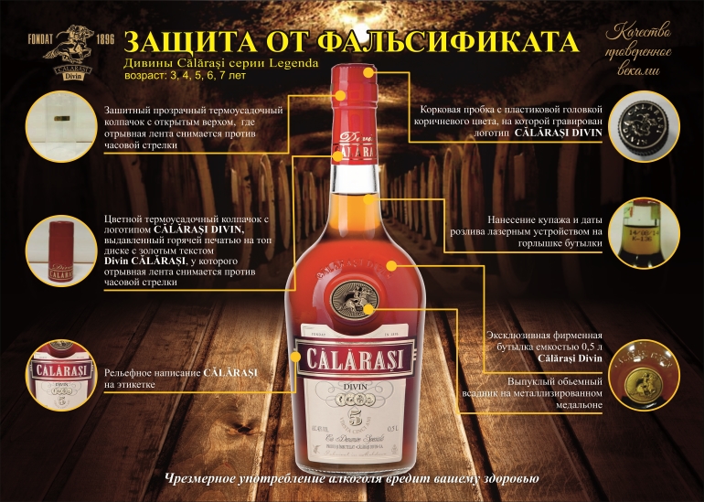 Как известно, фальсификаторы всегда подделывают самые востребованные продукты. От Călărași Divin в этот список попали наиболее популярные у потребителей дивины Călărași возраста от трех до семи лет из серии Legenda. Это происходит несмотря на то, что для защиты своей продукции от подделок, производитель заказывает довольно сложные бутылки и этикетки, которые на принтере не напечатаешь.